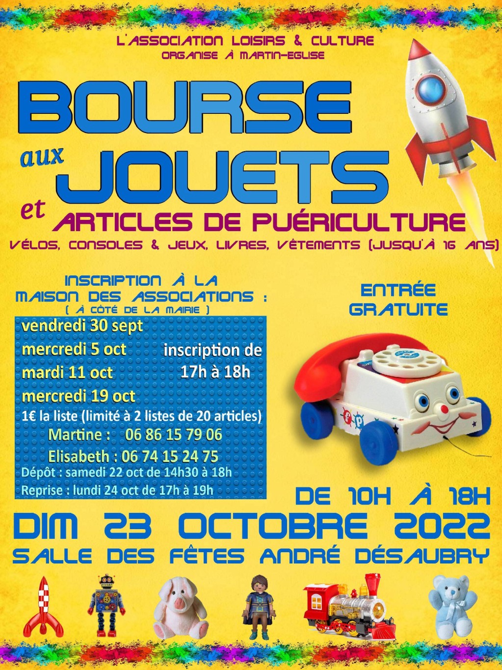 Dimanche 23 octobre 2022, de 10h00 à 18h00, salle des fêtes de Martin-Eglise “salle André Désaubry”, l’association Loisirs et Culture de Martin-Eglise organise une “Bourse aux jouets et articles de puériculture” : jouets, BD, consoles et jeux vidéos, vélos et vêtements enfants (jusqu’à 16 ans).