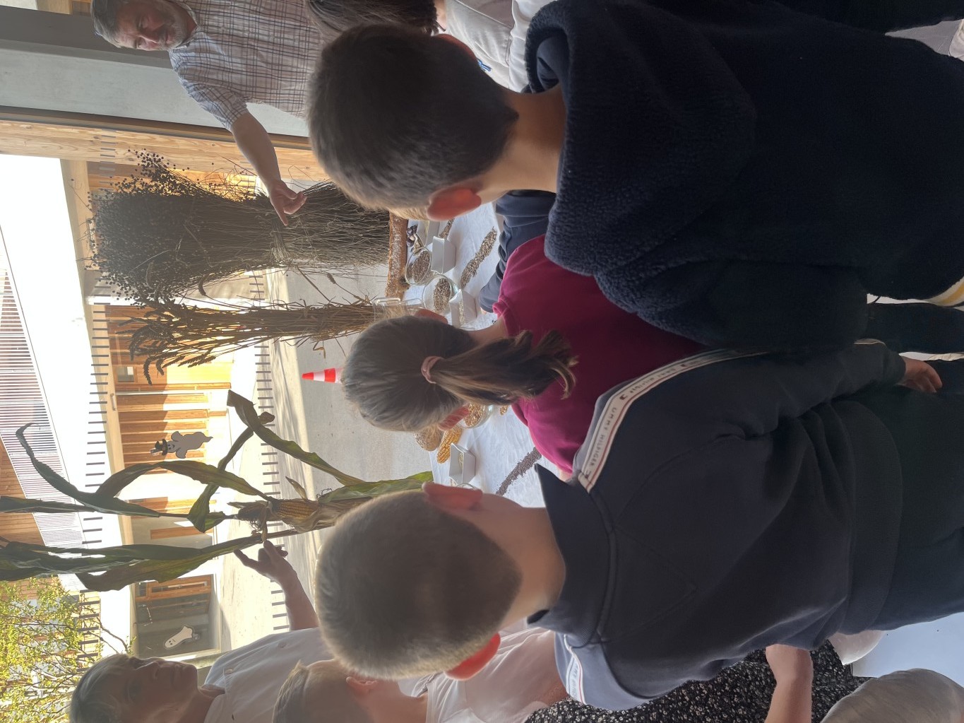 Durant la matinée, les enfants se sont rendus au réfectoire afin de découvrir différents types de graines pendant un atelier animé par la cuisinière Nathalie et Monsieur Hubert BOULEY, conseil municipal et agriculteur de Martin-Eglise, qui ont apporté différentes graines sous plusieurs formes.