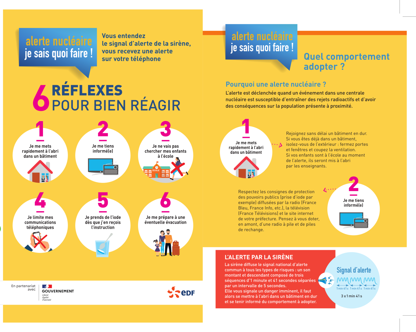 Anticiper et être préparé, c’est également important. Référez-vous aux 6 réflexes pour bien réagir et aux comportements à adopter en cas d’alerte nucléaire sur les flyers ci-dessous.