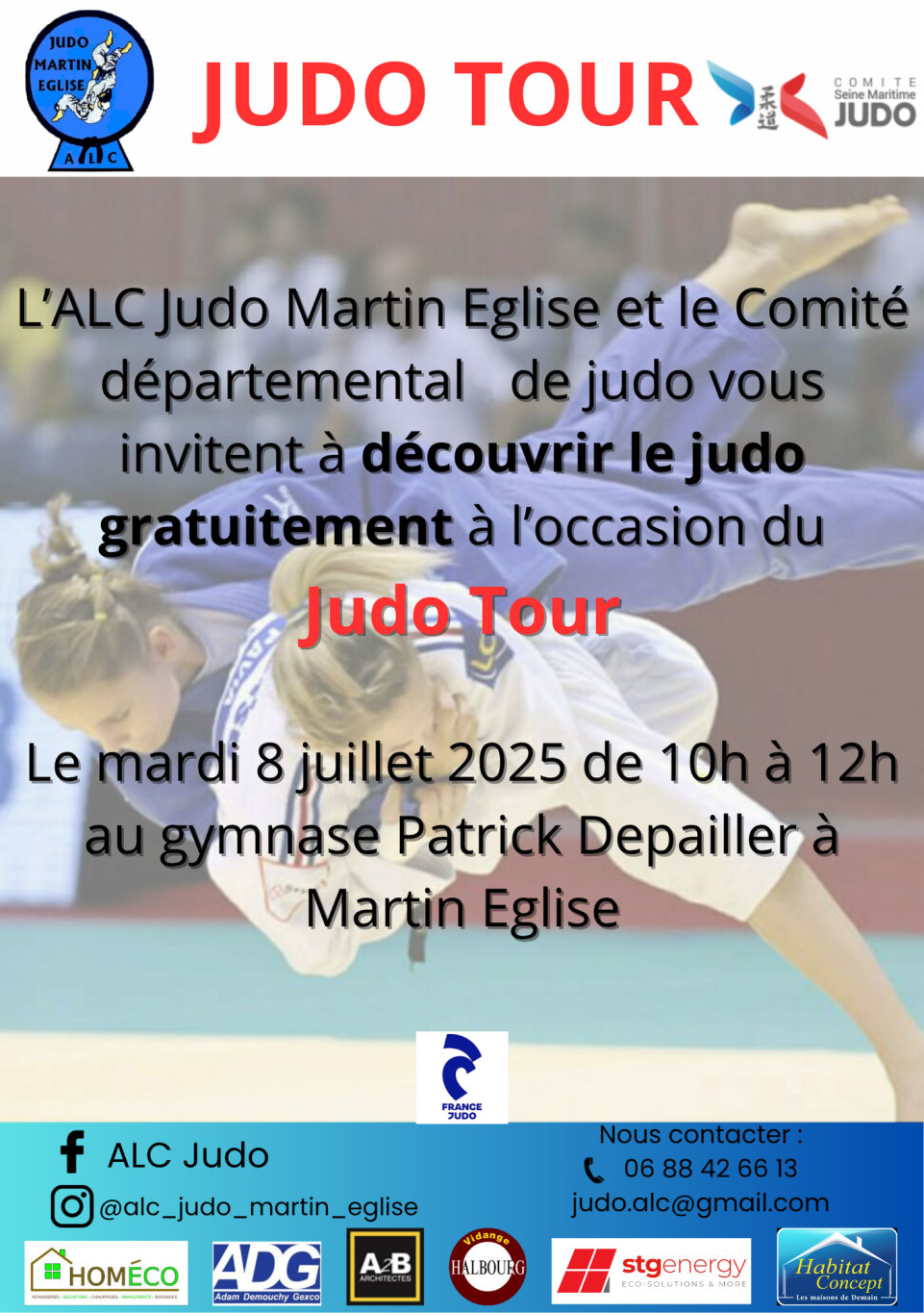 Le club de judo de Martin-Eglise accueille le mardi 8 juillet 2025 de 10h00 à 12h00, en partenariat avec le comité de judo de la Seine-Maritime, une étape du Judo Tour. Ouverte à tous, cette animation a pour but de faire découvrir le judo .