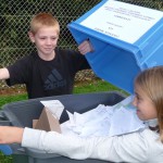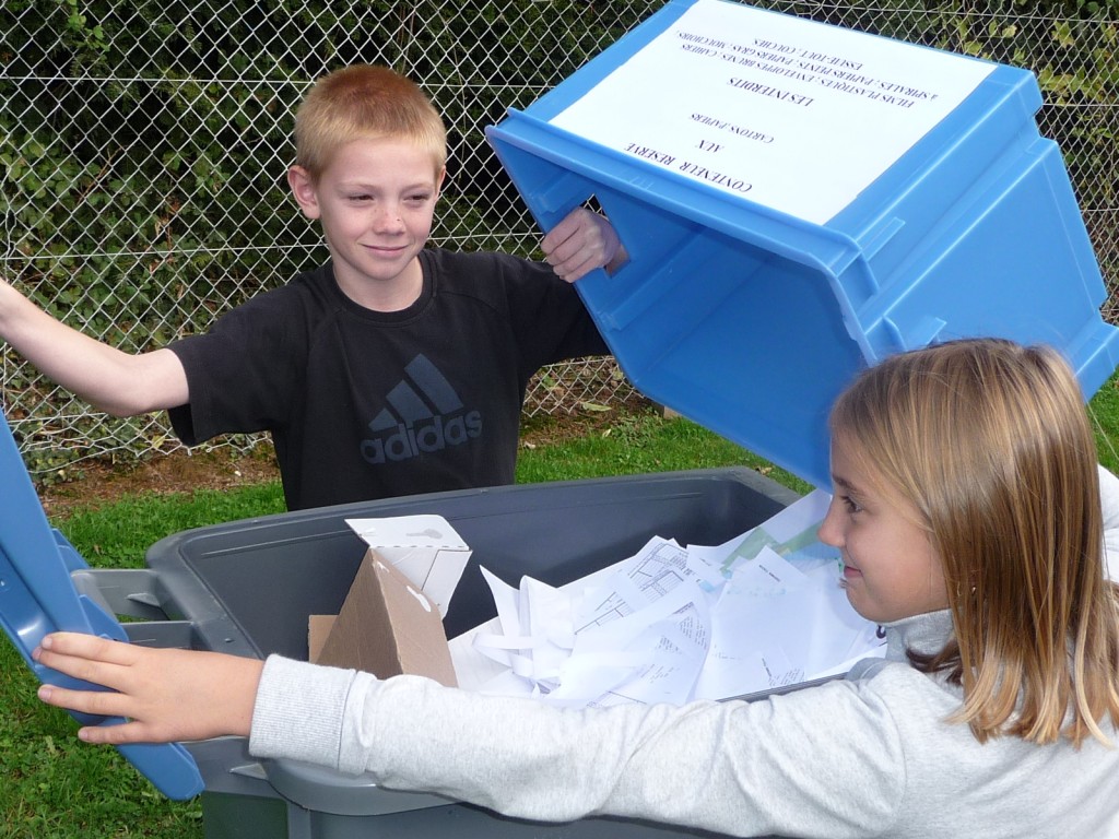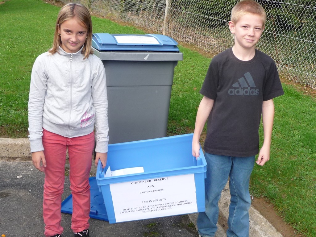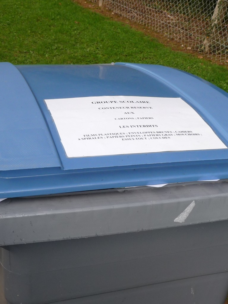 Dans chaque classe a été installée un mini bac de couleur bleue (pour mémoriser le grand container communal). Les collectes des papiers utilisés sont ainsi récupérées par les enfants et les adultes afin d’entrer ensuite dans le processus de recyclage.