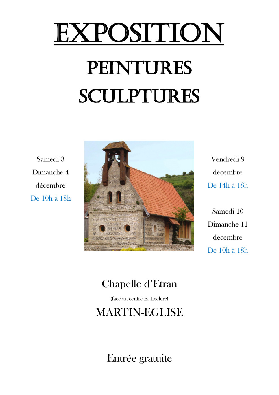 A l’occasion de leur exposition/vente annuelle, les peintres de “L’Atelier de La Chapelle” ainsi que les membres du groupe “Taille de pierre et Sculpture” vous accueillent à La Chapelle d’Etran.
