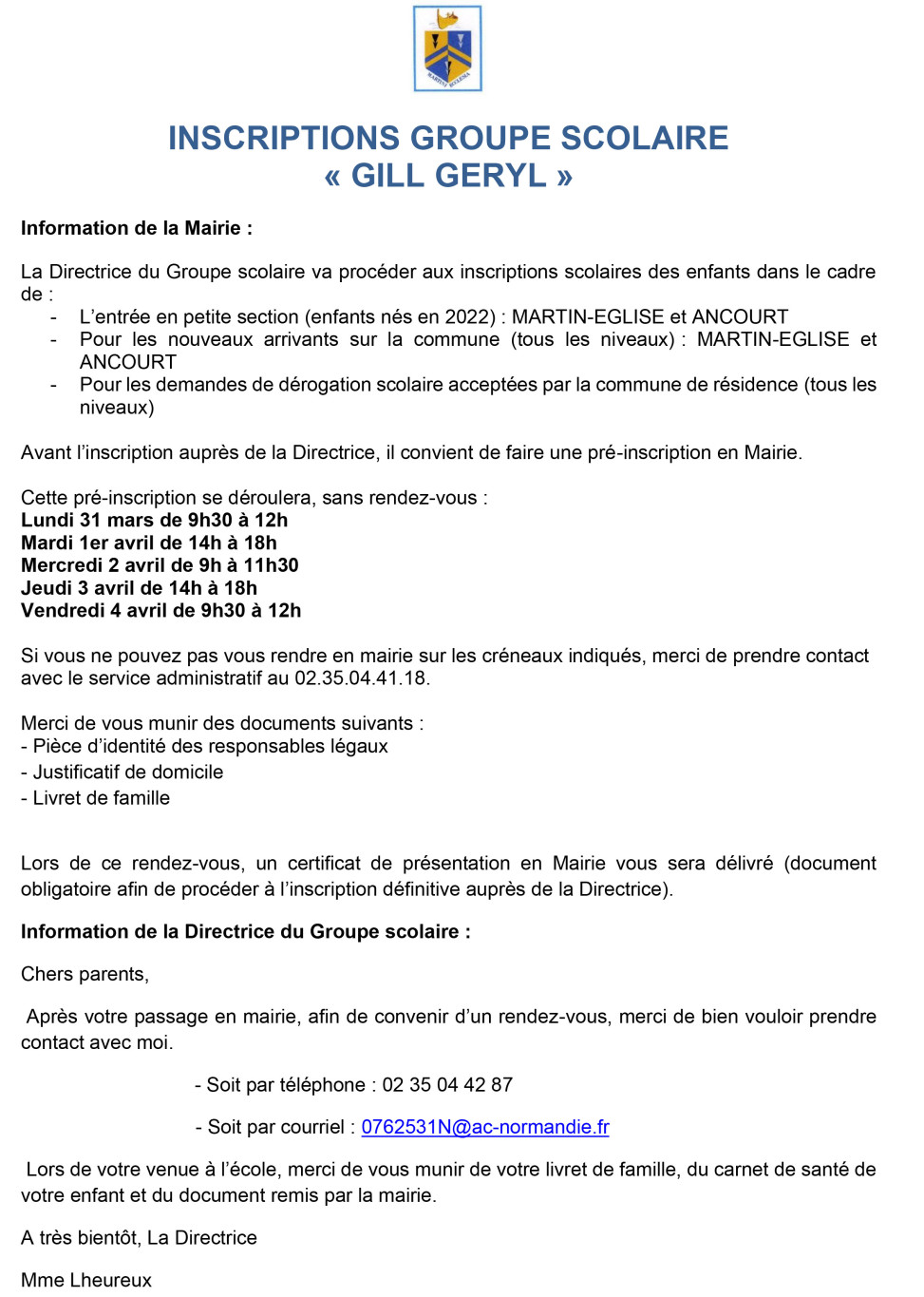 Information sur les inscriptions au groupe scolaire “Gill Géryl”