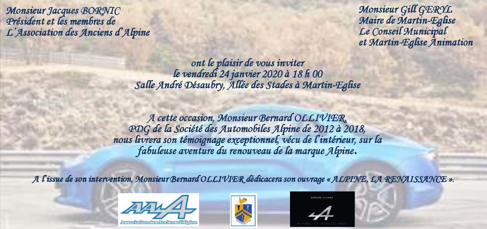 La commune de Martin-Eglise et l’Association des Anciens d’Alpine ont le plaisir de vous inviter, le 24 janvier prochain, au témoignage sur la renouveau de la marque Alpine que nous livrera Monsieur Bernard OLLIVIER, PDG de la Société des Automobiles Alpine de 2012 à 2018.
