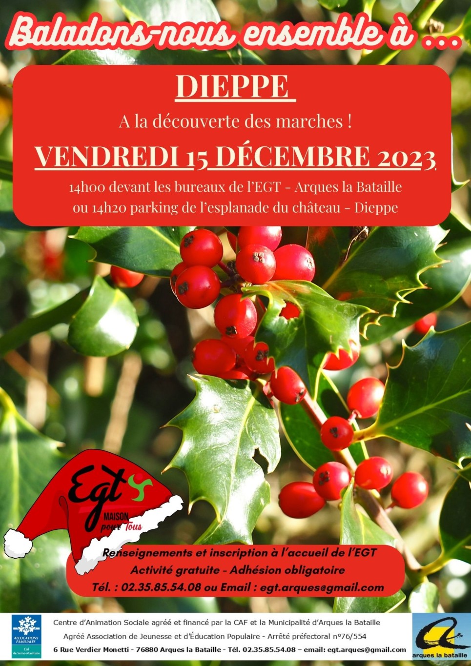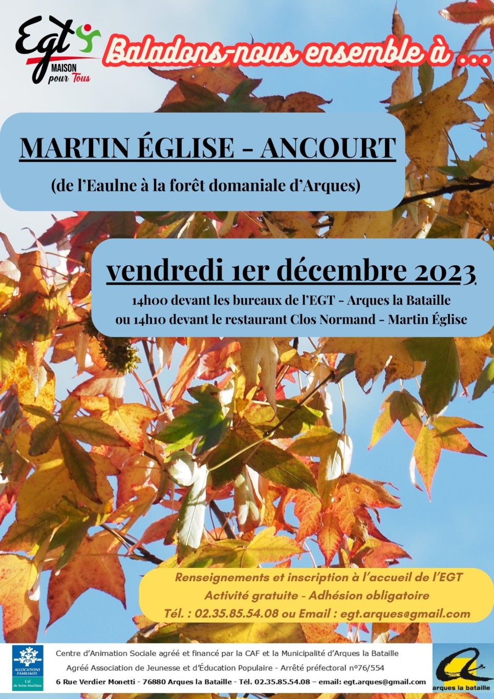 Nous vous proposons une sortie le vendredi 1er décembre en direction de Martin-Église / Ancourt. RDV à 14h devant l’EGT ou à 14h10 parking du Clos normand à Martin Église.