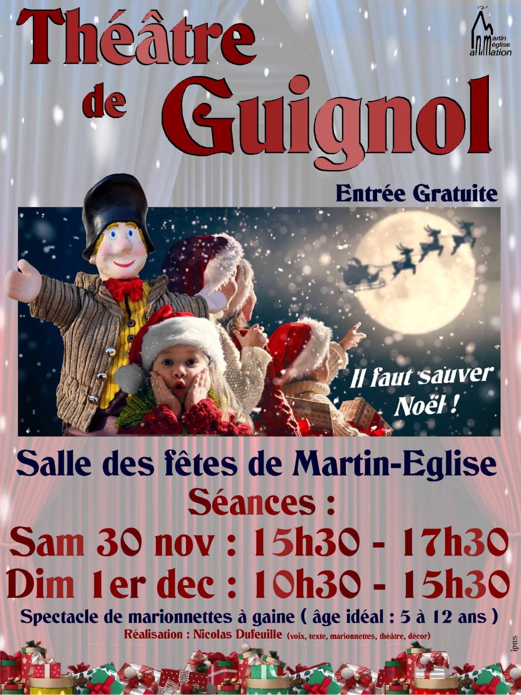 Spectacle de Noël pendant le Marché de Noël, avec les bénévoles du ‘Petit théâtre de Guignol’ qui se produiront dans la seconde salle (à droite en rentrant) de la salle des fêtes. Une véritable pièce de théâtre, ambiophonique, en 2 actes, intitulée ‘il faut sauver noël !’. Un spectacle de marionnettes à gaine dans un nouveau carrousel en bois contemporain. Venez retrouver Guignol et ses amis, dans ce joli spectacle, présenté pour la 1ère fois en 2023, avec la mère Michèle, Gnafron, le gendarme et … le père Noël !