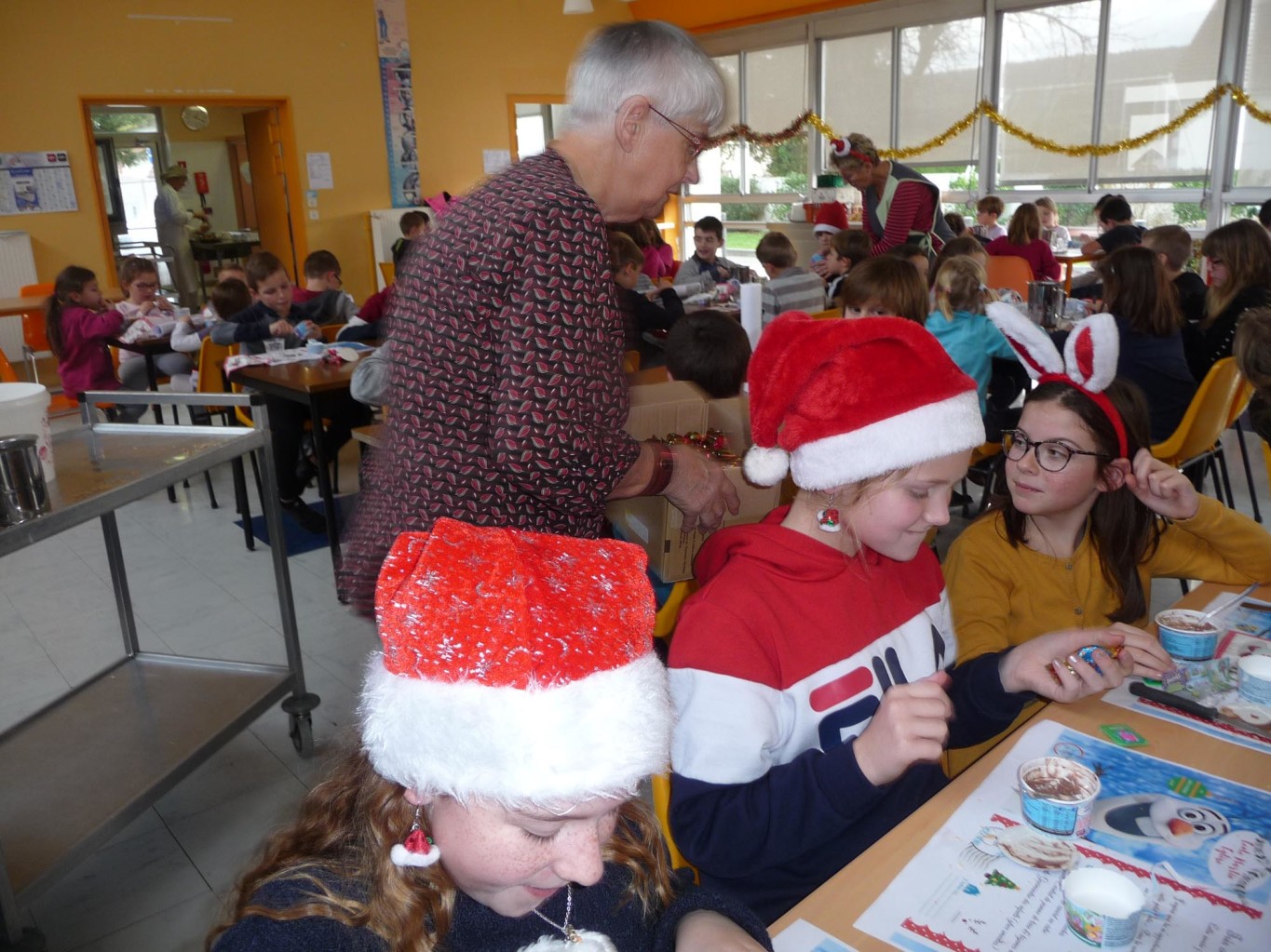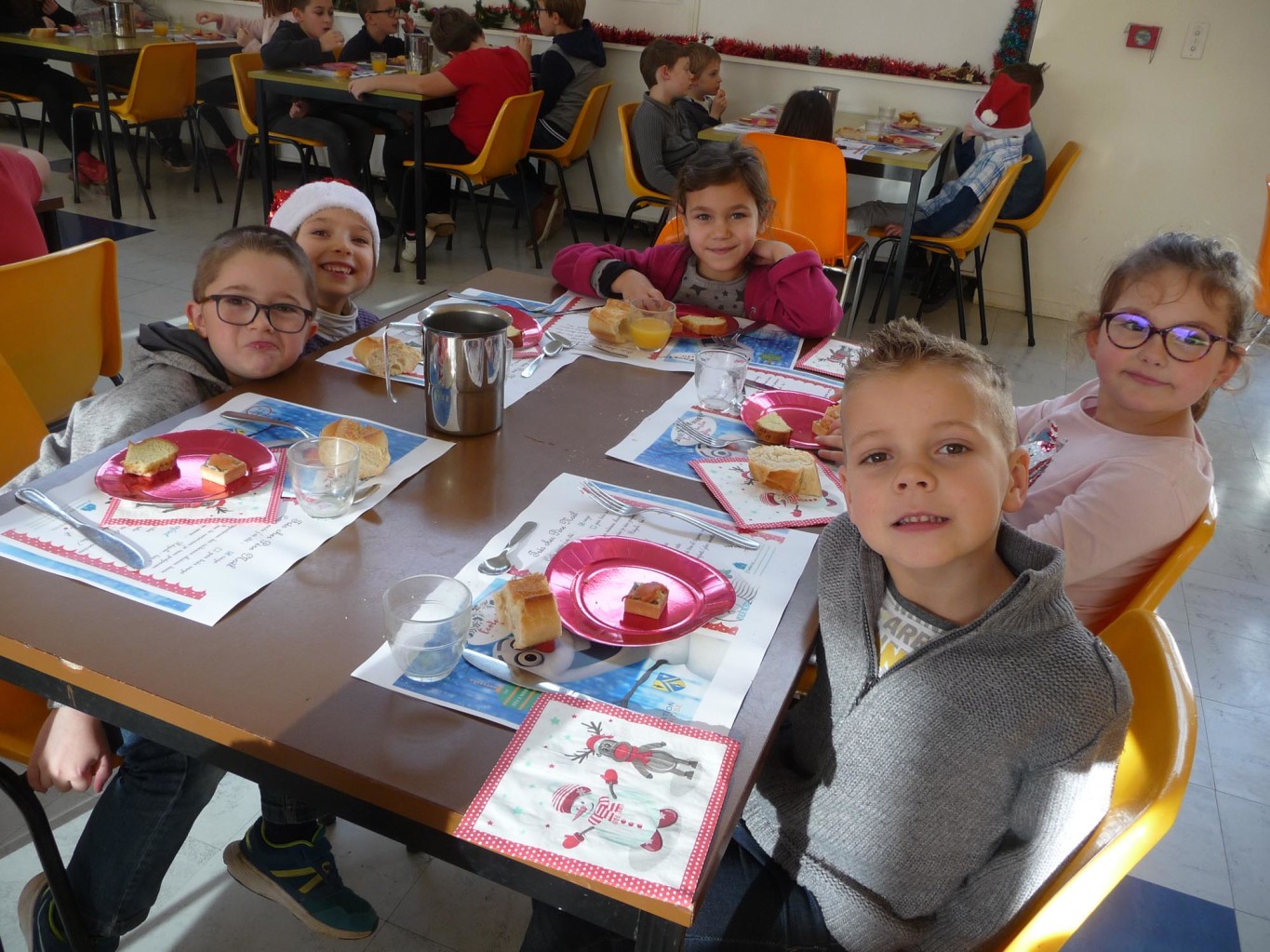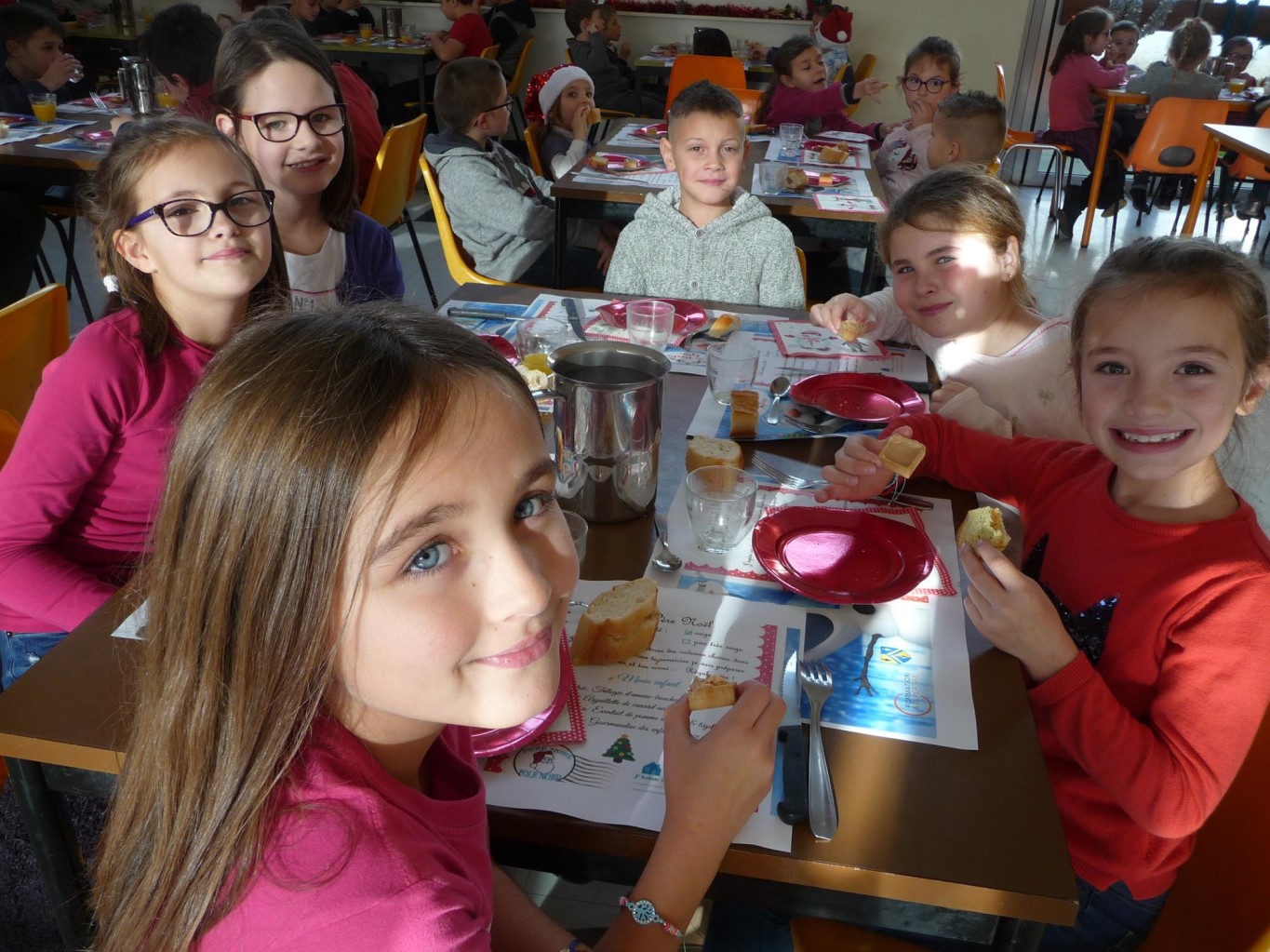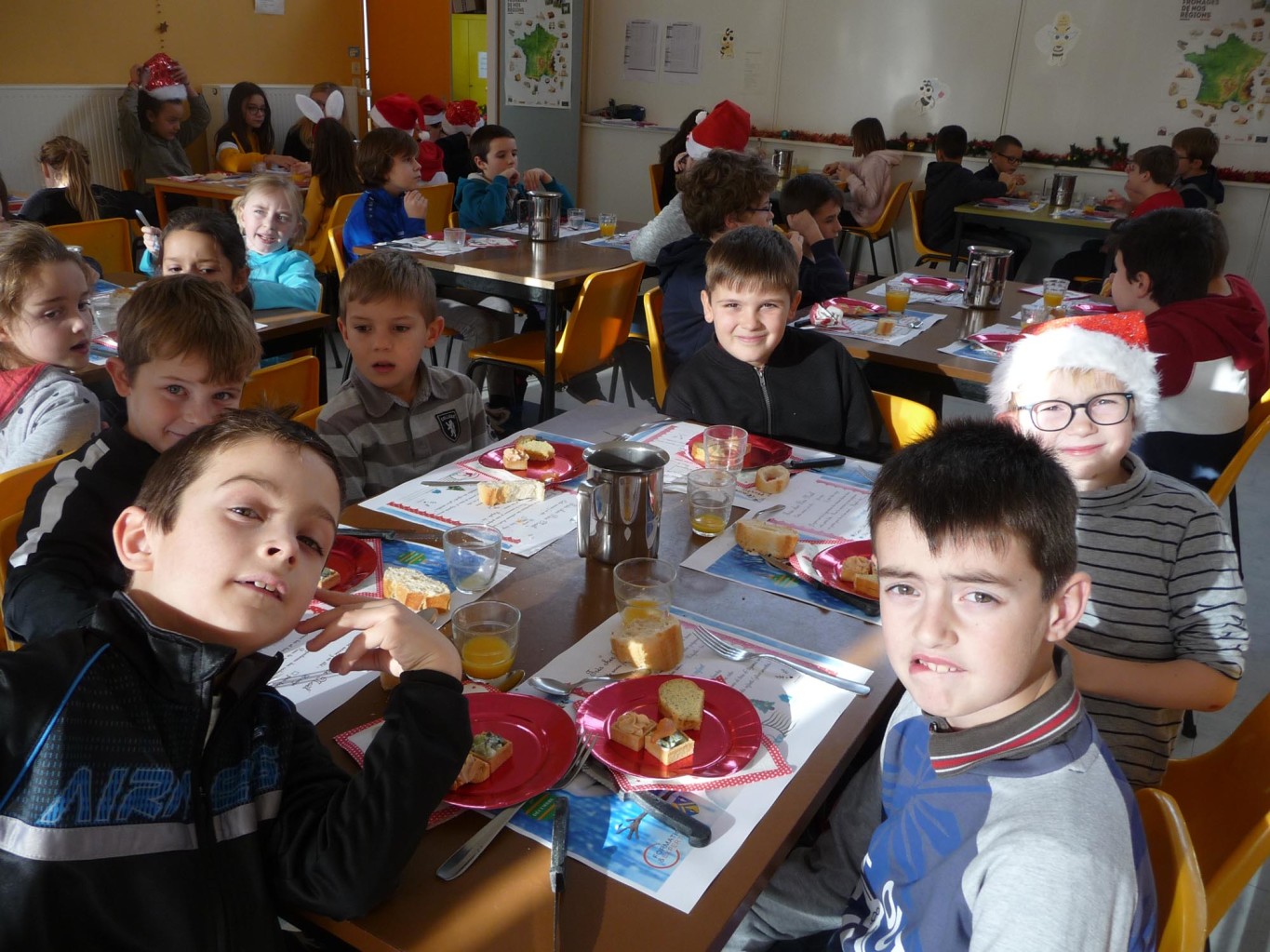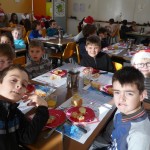 Nathalie Godey, chef de cuisine au restaurant scolaire a proposé un menu festif aux 130 élèves de l ‘école élémentaire et maternelle dans une ambiance de fête. Tous étaient absolument ravis du repas préparé avec amour.