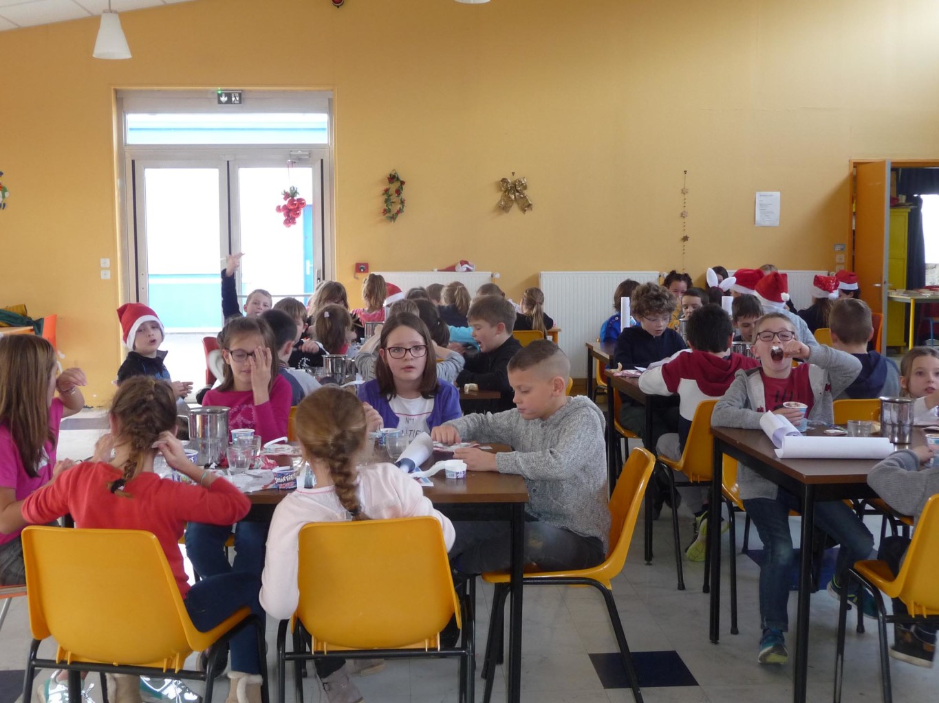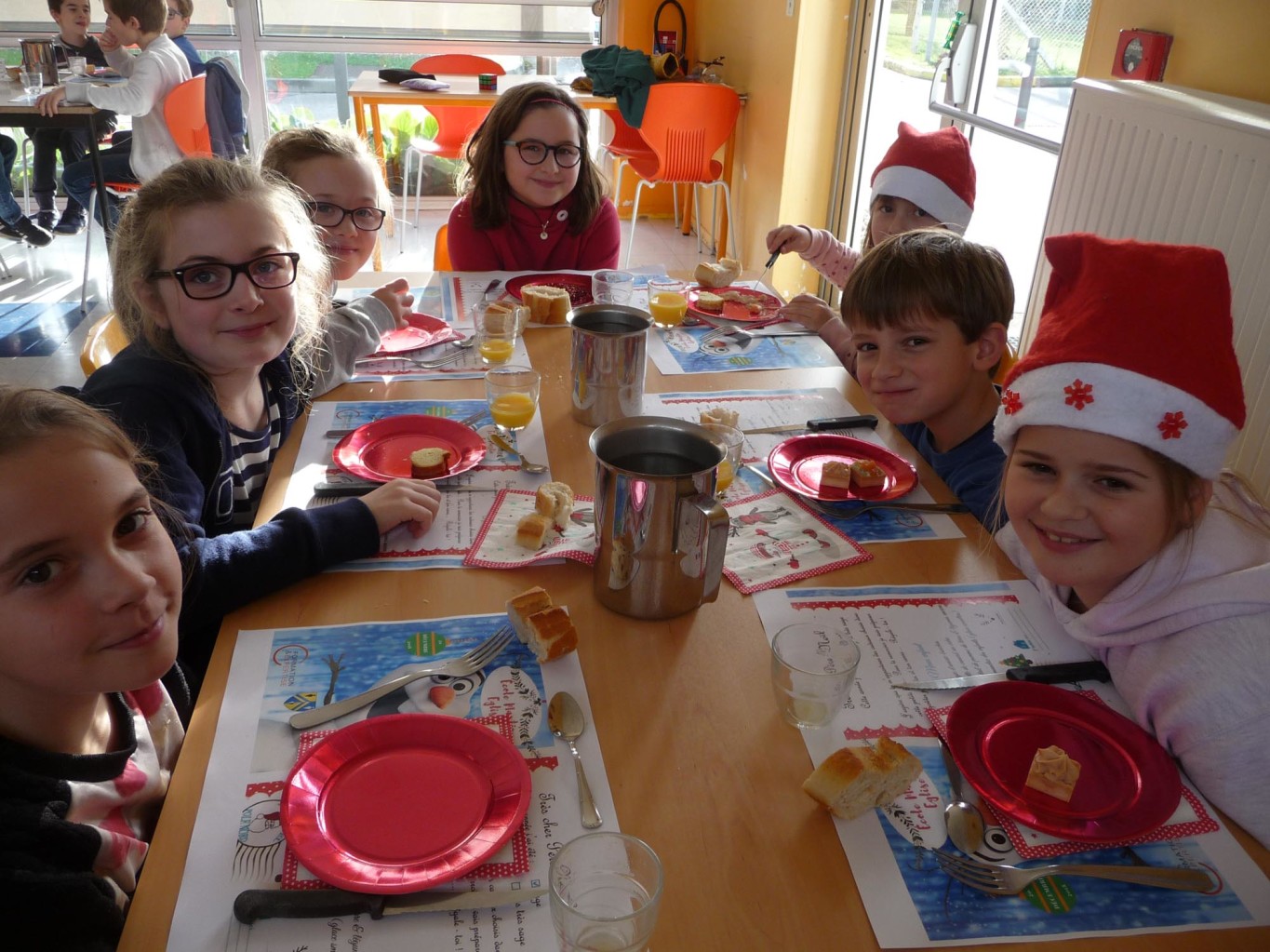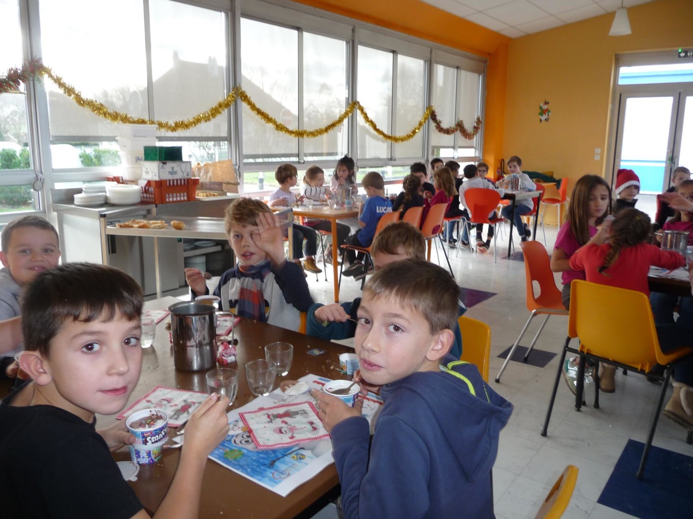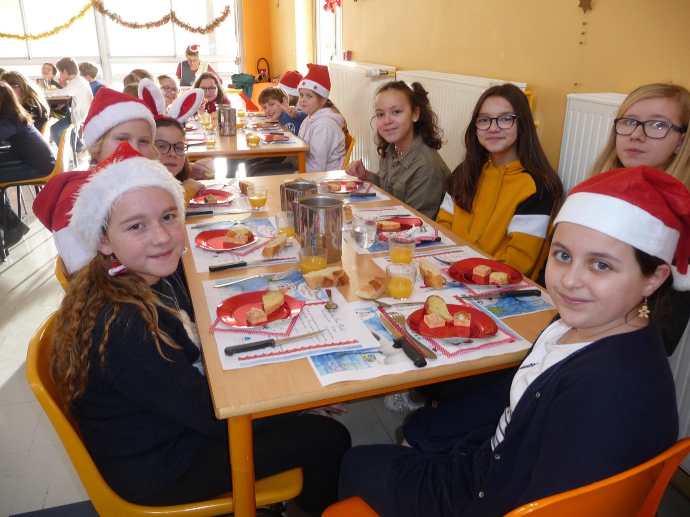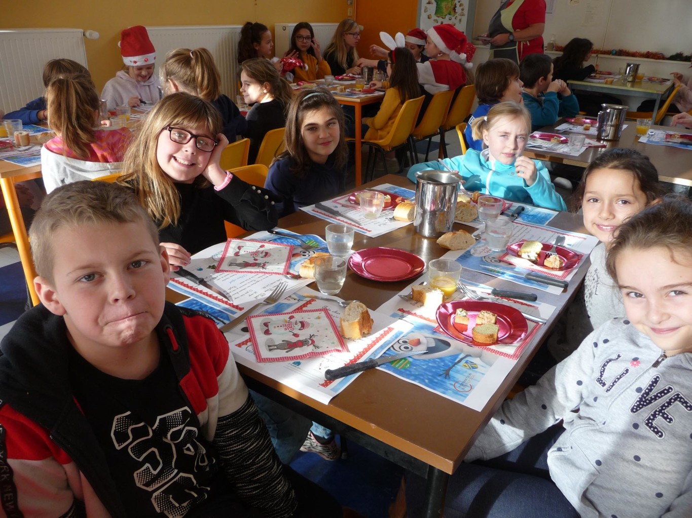 Nathalie Godey, chef de cuisine au restaurant scolaire a proposé un menu festif aux 130 élèves de l ‘école élémentaire et maternelle dans une ambiance de fête. Tous étaient absolument ravis du repas préparé avec amour.
