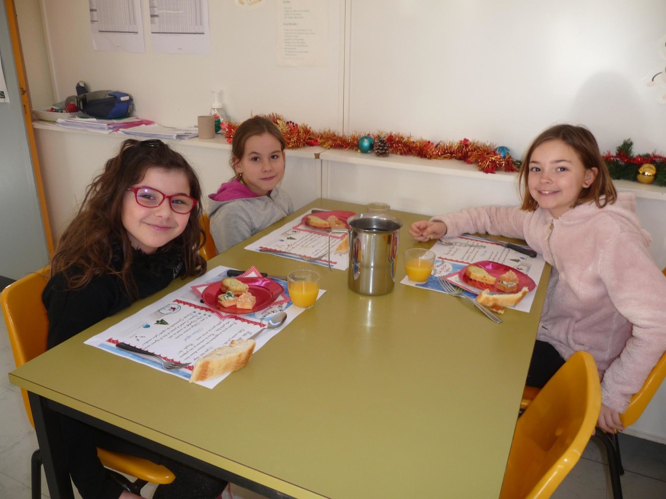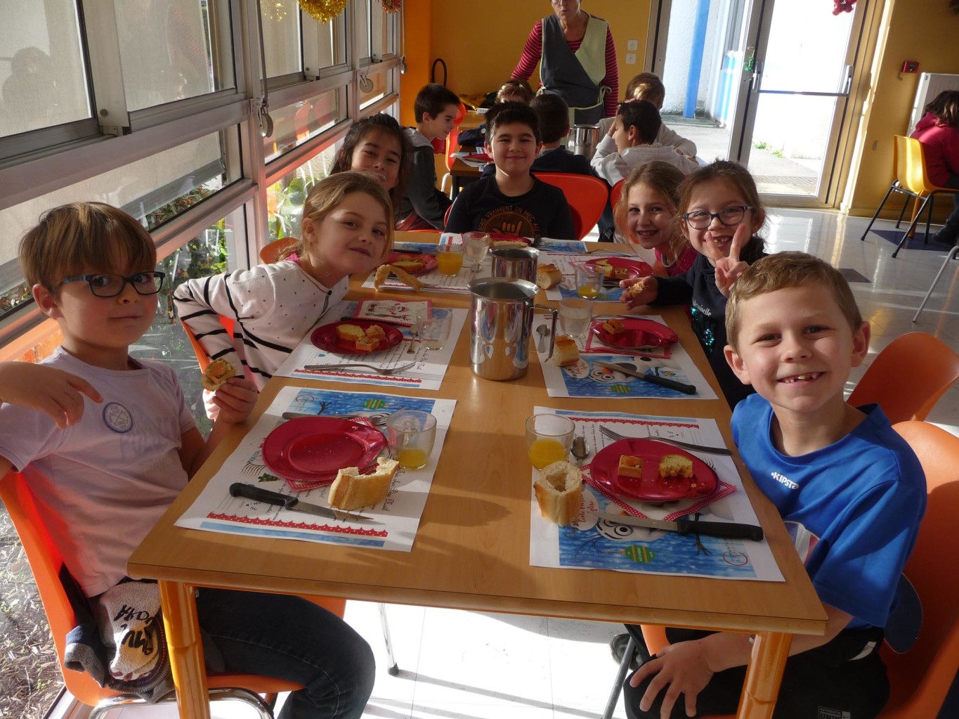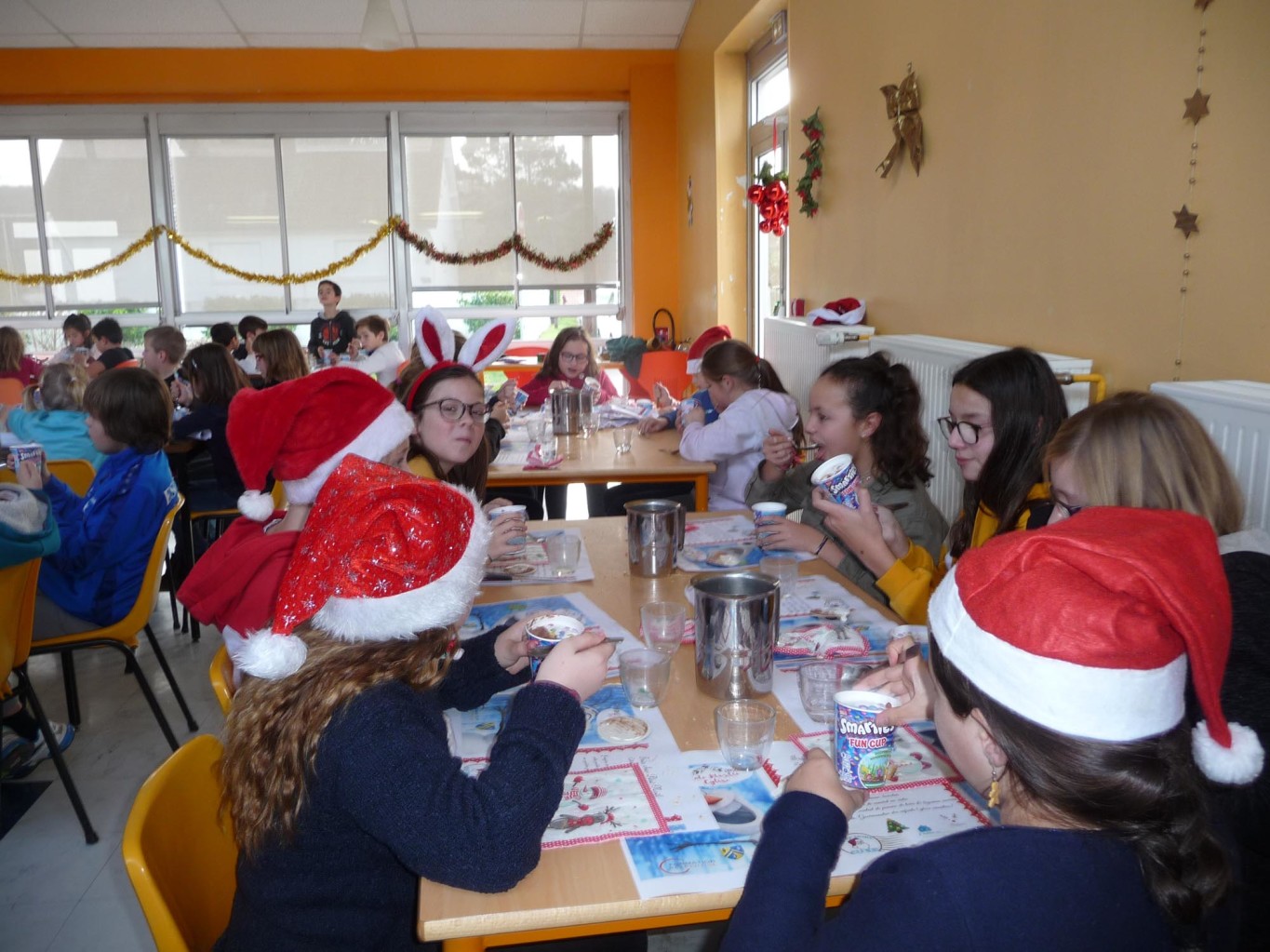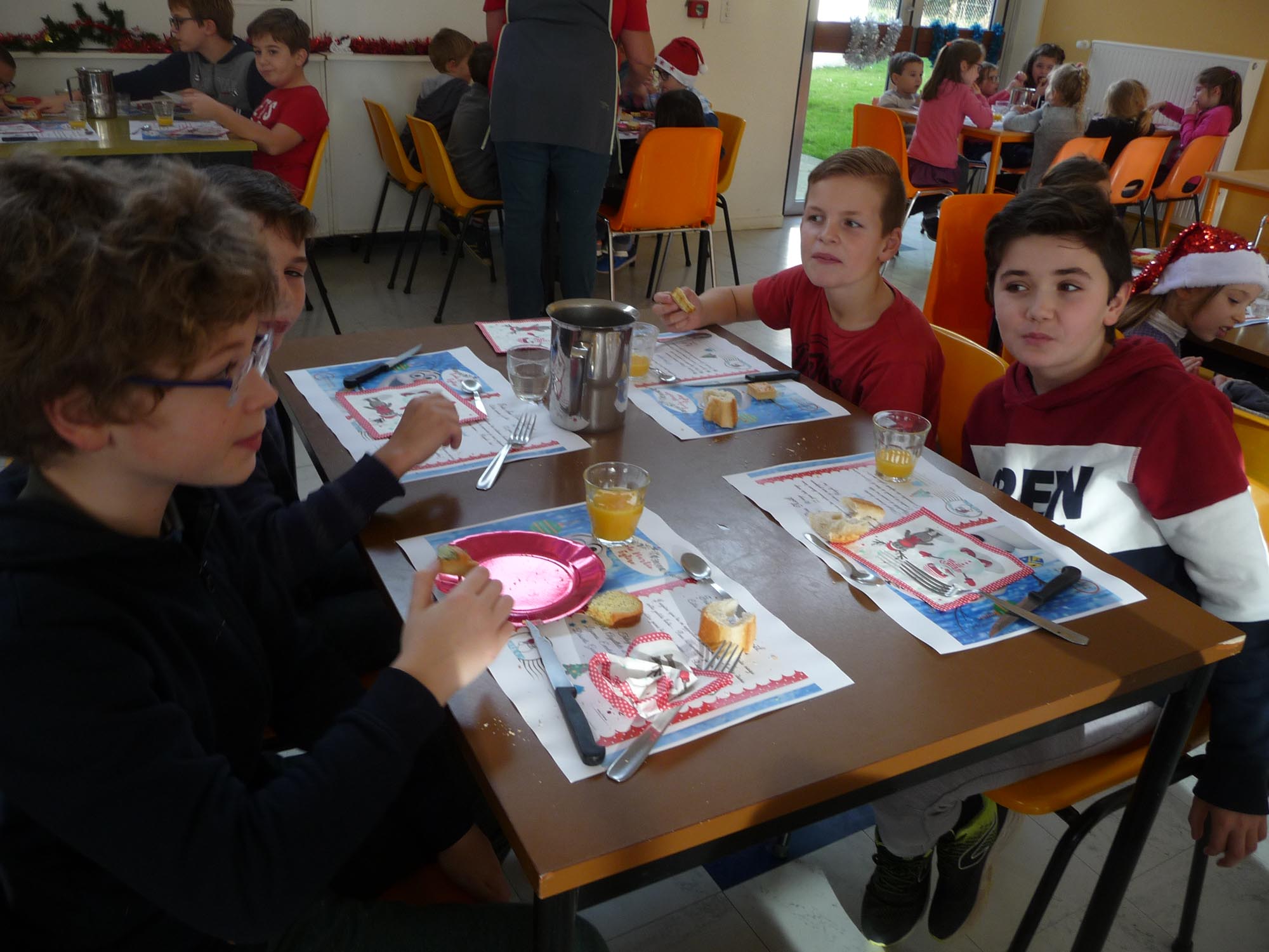 Nathalie Godey, chef de cuisine au restaurant scolaire a proposé un menu festif aux 130 élèves de l ‘école élémentaire et maternelle dans une ambiance de fête. Tous étaient absolument ravis du repas préparé avec amour.