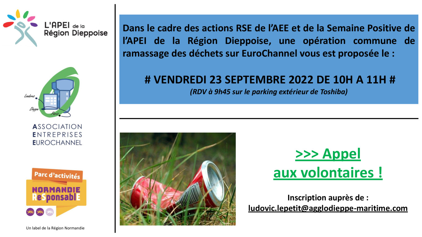 Dans le cadre des actions RSE de l’AEE et de la Semaine Positive de l’APEI de la Région Dieppoise, une opération commune de ramassage des déchets sur EuroChannel vous est proposée le :
