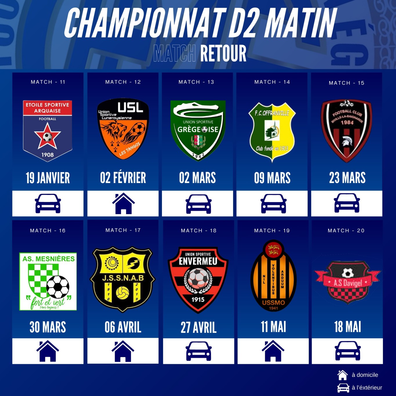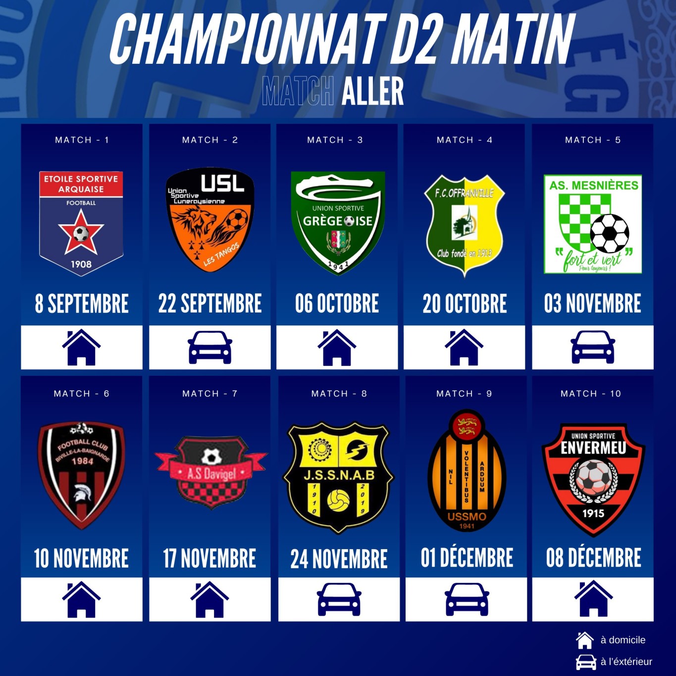 Pour les amateurs de football, vous trouverez ci-dessous le planning des matchs de notre équipe locale qui joue le dimanche matin.