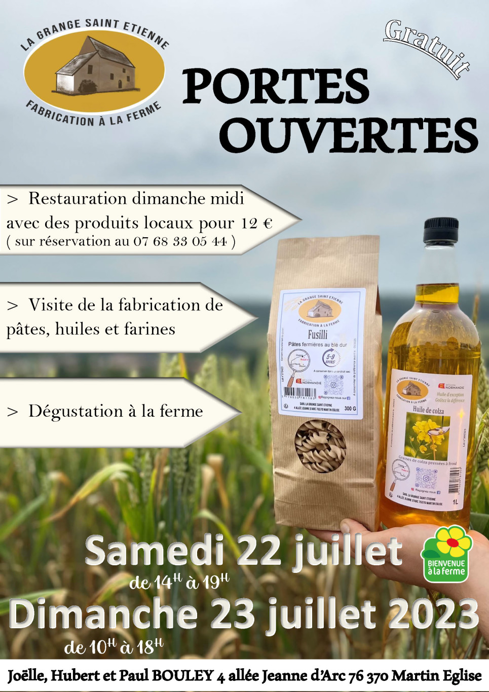 Lors du week-end du samedi 22 et dimanche 23 juillet 2023, Joëlle, Hubert et Paul seront heureux de vous recevoir à la grange Saint-Etienne pour vous faire découvrir leurs produits maison (farine, huiles et pâtes) et vous faire visiter leur atelier de fabrication.