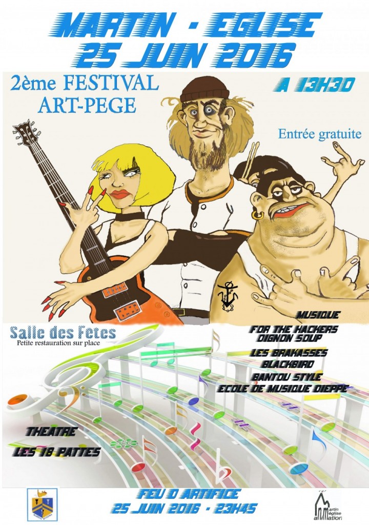 Le samedi 25 juin aura lieu le 2ème festival Art-Pège qui se déroulera à la salle des fêtes. Venez écouter différents groupes musicaux dès 13 h 30. Si vous n’avez pas découvert la dernière création théâtrale de la troupe des 18 pattes, venez les voir dès 19 heures. Et à partir de 23 h 45, un feu d’artifice sera tiré sur le stade de football.