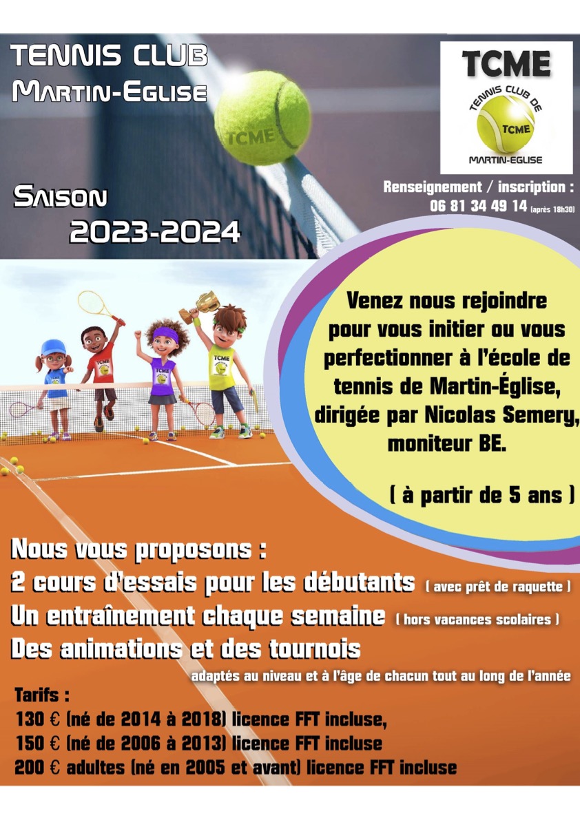 Vous avez 5 ans ou plus, venez nous rejoindre pour vous initier ou vous perfectionner à l’école de tennis de Martin-Église dirigée par Nicolas Semery, moniteur BE.