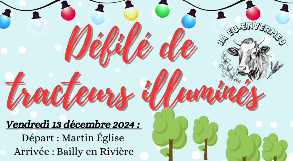 Les Jeunes Agriculteurs Eu-Envermeu organise le vendredi 13 décembre un défilé de tracteurs illuminés. Le départ aura lieu dans notre commune à 18h30, ils partiront du stade et se dirigeront vers la place Mayenne, ils remonteront la rue Abbé Malais puis prendront la direction d’Ancourt pour ensuite se rendre à Bailly-en-Rivière.