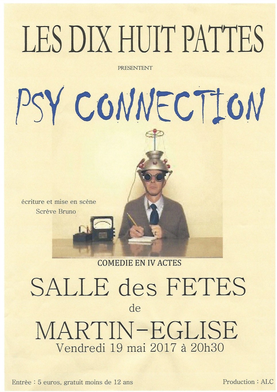 Vendredi 19 mai,à 20 h 30, à la salle des fêtes, la troupe des 18 pattes est heureuse de vous présenter sa nouvelle création : “Psy Connection”. Cette comédie en 4 actes, écrite et mise en scène par Bruno Scrève, vous réservera des surprises et pleins de rebondissements. Vous y croiserez des personnages loufoques, émouvants voire très inquiétants. Bonne humeur et rire seront au rendez-vous.