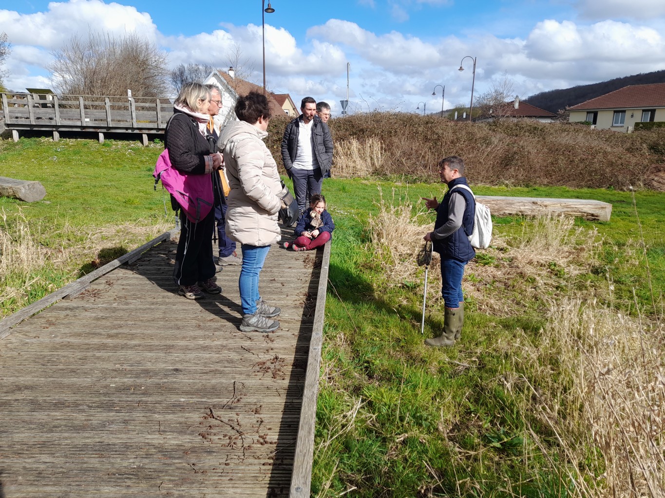 Au niveau de la Prairie humide, il est expliqué qu’il y a eu des interventions humaines pour éliminer des pousses d’aulnes qui étaient trop envahissants. La fauche est effectuée à la main, ramassée immédiatement et par zone afin de ne pas appauvrir le sol. Des saules ont été plantés pour isoler du bruit et de la vue de la route départementale, et idéal pour leurs pouvoirs filtrants de l’eau par leurs racines. Une explication bien détaillée sur les espèces pouvant vivre au niveau des marres et dans les zones humides à été faite.